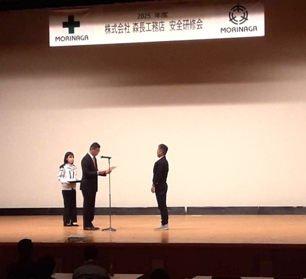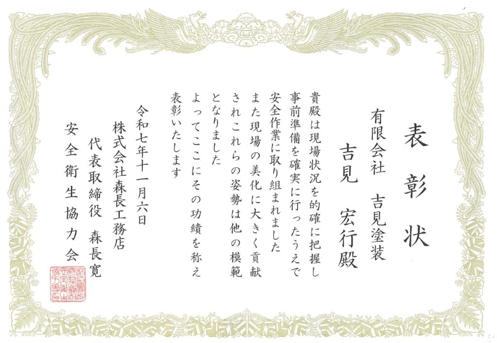 株式会社森長工務店 様より、協力会社の有限会社吉見塗装 様が表彰状をいただきました。