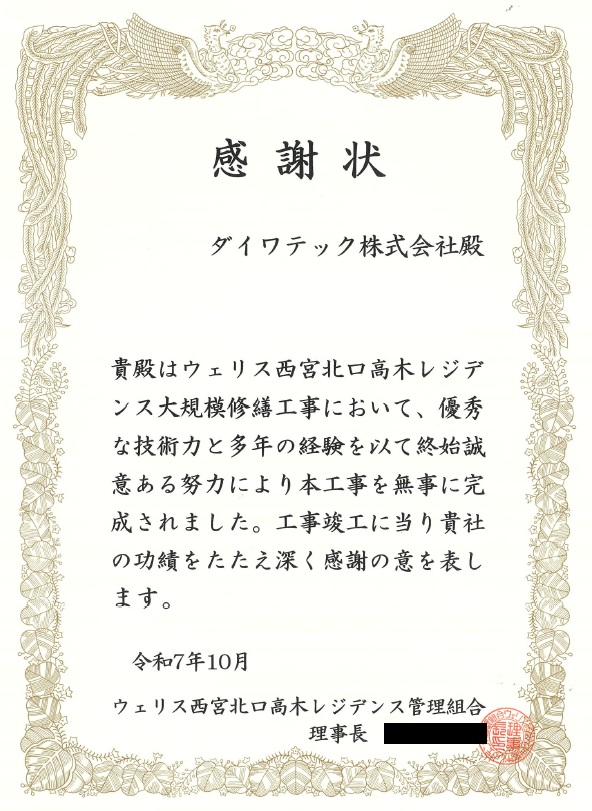 ウェリス西宮北口高木レジデンス管理組合様より感謝状をいただきました