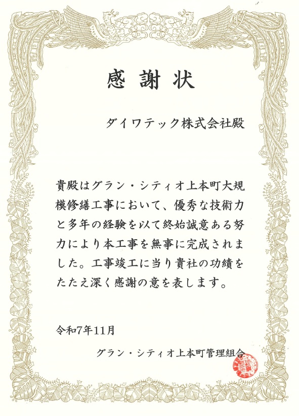 グラン・シティオ上本町管理組合様より感謝状をいただきました