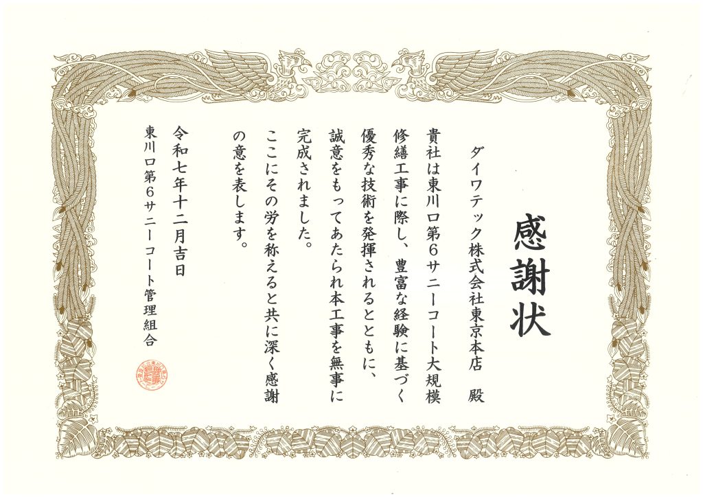 東川口第6サニーコート管理組合様より感謝状をいただきました