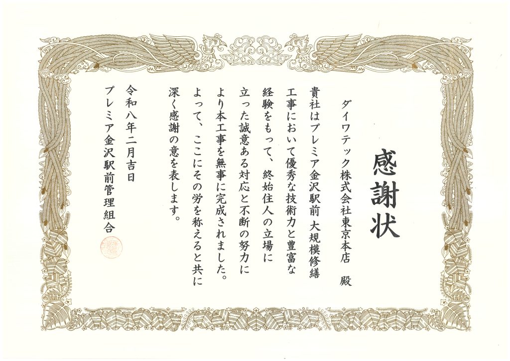 プレミア金沢駅前管理組合様より感謝状を頂きました。