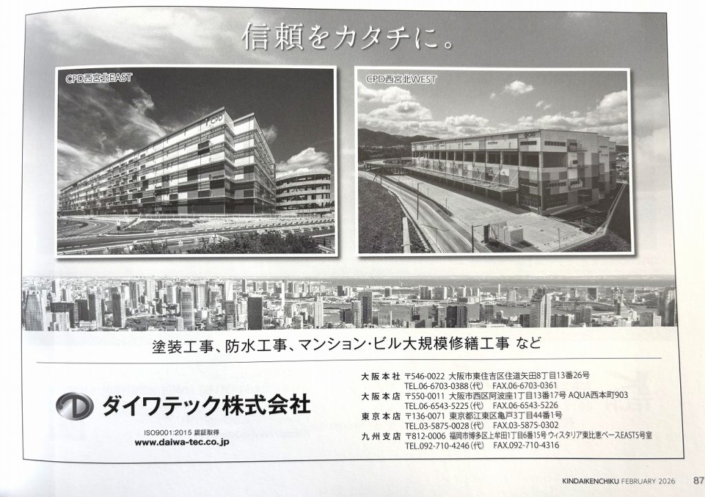 新着情報 NEWS メディア掲載 2026.03.23 建築の専門雑誌【近代建築】に掲載されました 建築の専門雑誌【近代建築】に弊社が塗装工事を施工しました物件が掲載されました ■近代建築2月号 物流施設の計画と設計2026 昨年に引き続き当特集に掲載いただきました 今後も安全と品質を第一に取り組んで参ります 新着情報一覧へ戻る 表彰状をいただきました(大阪) >>